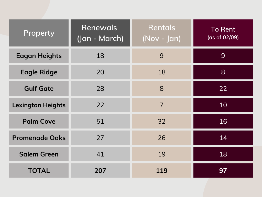 As we look at the rental review numbers, it’s clear we have important work ahead of us. The market is softer than it was last year, and we began 2026 with more homes to rent than we did at the start of 2025 (74 at that time). That means we must be proactive, strategic, and unified in our approach. Leasing success does not live solely within the office job description—it is a team effort across every department and every property. Every interaction is an opportunity to promote our communities!