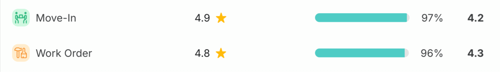 The image below shows our move-in and work order feedback results across all communities last year. The stars are our average rating, the percentages are the number of 5-star reviews, and the bold numbers at the end are the industry average. The results speak for themselves—and they’re helping set a new standard across our portfolio. Thank you for the pride you take in your work and for delivering outstanding service to both residents and prospects. Here’s to more five-star moments ahead!
