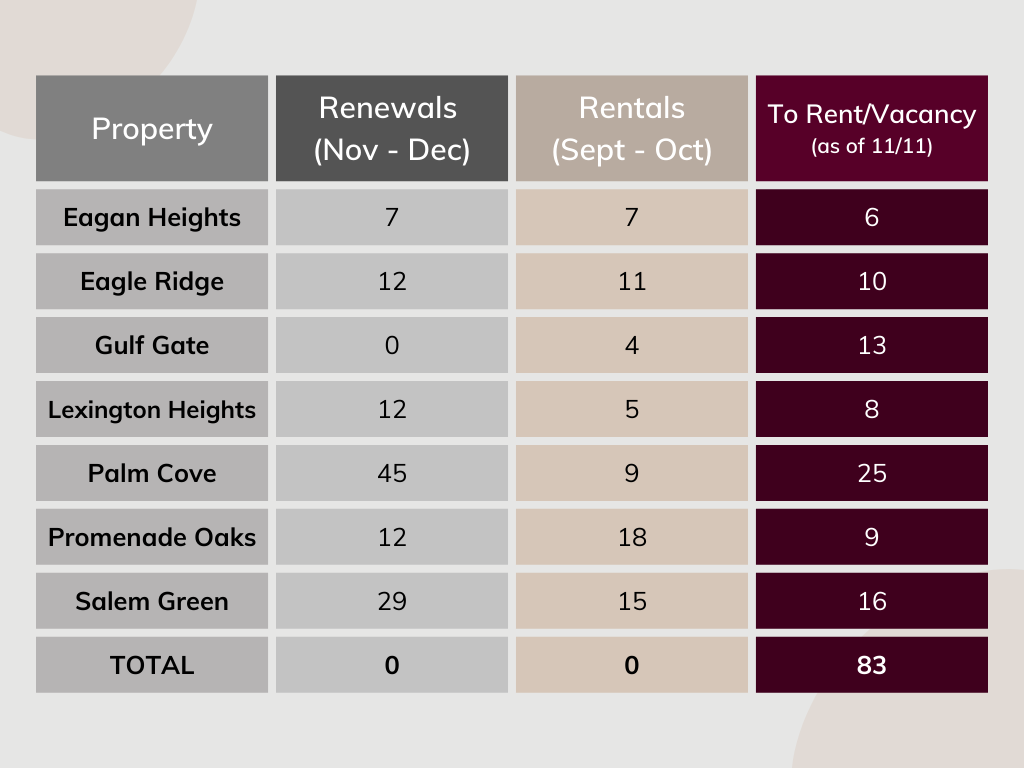 - Promenade Oaks community updates, including a complete Rental Office makeover and upgrades to the Party Room, refreshing a key space for residents with a new kitchen, flooring, furnishings, and decor