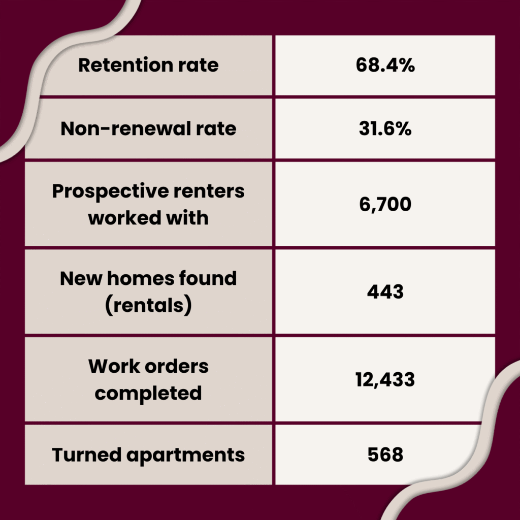 These numbers reflect more than operational performance last year—they represent the thousands of people whose lives we touch every day. From helping 6,700 prospective renters with their apartment search journey to welcoming 443 new residents home, maintaining strong relationships with a 68.4% retention rate, completing over 12,400 work orders, and preparing 568 apartment homes for new beginnings—none of this happens without the collective effort of our teams. Thank you for making a difference!